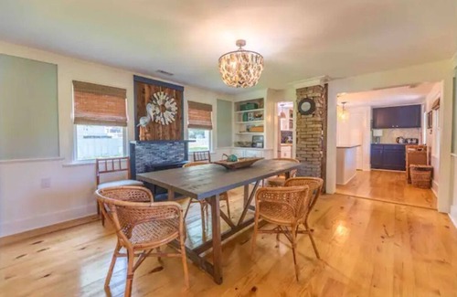 Upon arrival you will first enter into a well appointed but charming kitchen with a custom recycled glass island perfect for prepping or serving meals. All the appliances are new including a gas range. The kitchen is stocked with everything you need to cook breakfast , lunch or an elaborate seafood feast from the local waters. There is also a well stocked coffee bar perfectly placed to grab a cup of coffee as you head out onto the porch. Also in the kitchen you will find an enclosed washer and dryer. The kitchen opens up into the large dining area which features a gas fireplace. The table seats 6 and is perfect for enjoying meals, games or working on a laptop.