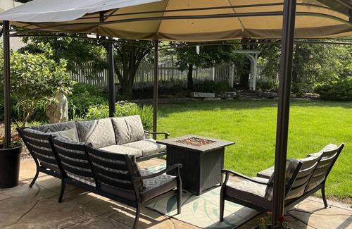 Family-Friendly Amenities: Enjoy shared spaces like a covered sectional, fire pit, grill, and picnic table, all while surrounded by a welcoming white picket privacy fence, making it perfect for both family gatherings and bridal party fun.