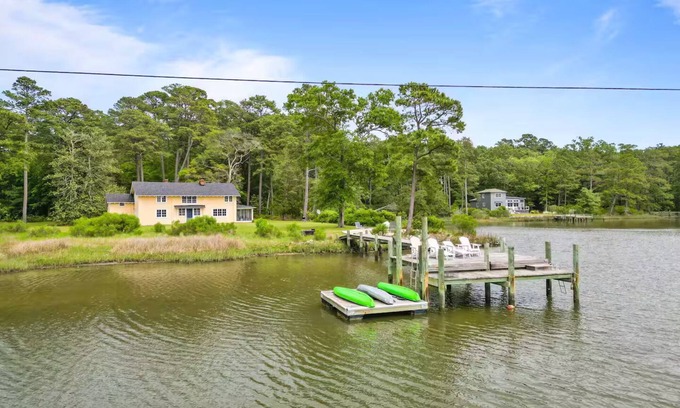Bring your family and relax in this Log Cabin School, hand built in 1899. Situated on a private peninsula, and with over 10 acres you will have unbelievable views and access to everything nature has to offer on both land and water! With its own private dock and beach, you will be equipped with kayaks, canoes, fishing rods, and crab traps to spend the day adventuring the Chesapeake Bay. Or you can sit back and relax on one of many water side hammocks, or just enjoy a fire on the private beach.