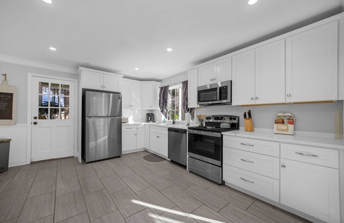 This newly renovated single family home offers the a huge yard surrounded by woods yet it is close to everything. With four bedrooms and two full bathrooms it is perfect for groups and families and accommodates up to nine adults or eleven total guests.