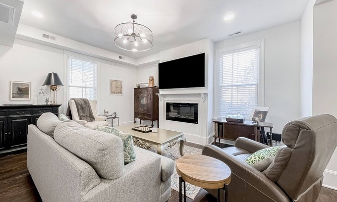 The spacious interior has been beautifully renovated and refurbished with top-of-the-line appliances and amenities to ensure the utmost comfort throughout your stay. Gleaming stainless steel kitchen appliances, immaculate counters, and a sparkling farmhouse sink are sure to inspire crafted culinary creations. An electric fireplace, a large smart TV, and an array of comfortable furniture welcome you to cozy gatherings in the living room.