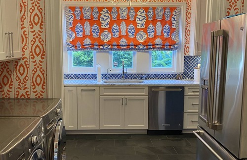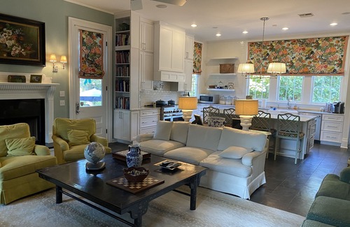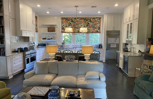 Stately, warm and inviting 3-story home located in Sterling Grove Historic District just blocks from downtown Lafayette and conveniently located near I-10/I-49 /Hwy 90 as well as the airport. This hone sits on 1.7 acres, has a welcoming front porch, sprawling lawn, patio space, Limestone fire pit area, and spacious grounds behind it’s 3/1 guest cottage (also separately rentable). Front entry parlor space has two comfortable love seats opens to the adjacent living area with baby grand piano and sitting area with Smart TV in a mirrored armoire. Both the front parlor and front living room are connected with double 9 ft original cypress panel pocket doors. The front living area opens to a formal dining room through pocket doors and provides seating for up to 10-12. The walls are covered in caramel silk wallpaper which was hand-painted in a chinoiserie style with beautiful landscapes and intricate birds throughout.. Off the formal dining area is a small soapstone-countered China /crystal storage pass -thru which opens through a swing service door onto butler pantry which features carrera counters, a large sink, dishwasher, French door refrigerator w/freezer. ,double convection wall ovens and warming/proofing drawer. Pocket doors here remain open to laundry area with front loading washer/dryer/ storage/small hanging closet. Large updated kitchen featuring carrera marble Countertops and oversized island with seating for four, 48 inch dual-fuel 6 burner range with griddle, 2 dishwashers, “sonic” ice machine, 2 beverage fridges, Built in all fridge and all freezer (in adjacent closet), microwave. Kitchen space opens to a spacious den with ample sofas/club chairs seating , a wood-burning fireplace and extra large Smart TV. Adjacent to den is a pecky cypress-walled casual eating space for up to 8 people featuring a round table with a removable custom “lazy susan “. Also has Snart TV and can double as a poker room! This room was the home’s original kitchen and features a wall of Continual custom cypress butler cabinetry original to the home. Connecting these spaces is a hallway with a half-bath, rear entry hall and light-filled home office space with wireless laser printer. Featuring an ample under stairwell storage closet, the stairwell in front room features a landing with an oversized window seat. Second floor fabric-covered hallway with original light fixtures opens onto 4 bedrooms. There is a master suite with king size bed and private bathroom with a separate bath, shower and toilet closet Across the hall is a second bedroom with Full-sized Bed and private full bath . There are two additional bedrooms which share a hallway bath featuring a claw foot tub/shower with curtain. One of these bedrooms has a full-sized bed four-poster bed. The fourth has a king size bed as well as an antique caned daybed for extra sleeping space if needed . All bedrooms have mantles and original coal burning fireplaces which are no longer in use. The third floor is a fully carpeted bonus room space that was previously a walk-in attic . It features ample den space with a sofa and two oversized bean bags, large screen smart tv with gaming devices, electronic full-sized air hockey table, gym-quality Tectrix brand stairmaster, “kitchen” corner with microwave, sink and beverage fridge, full bath, and an under TV cabinet area which hides away 5 memory foam beds which may be pulled out as needed for group sleepovers. The two oversized Corduroy brand beanbags each contain a foam filled full-sized bed bag. All Bedding/pillows are provided and stored conveniently in adjacent cabinetry. Plenty of toys, board games and books for kids of all ages are stored iin cabinets around the large room. Patio space off of den has ample seating , propane fuel fire table/coffee table , dining table for 6 , XL Big Green Egg Ceramic Grill, and a separate crushed limestone wood fire pit w/ seating for 8. Outdoor ping pong table and basketball goal are adjacent to house and covered parking. Tetherball in front yard