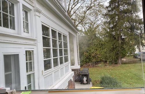 The living room is on the west side featuring a large marble fireplace with window seats on each side. There is original art throughout the house. French doors to the back lead to a 3-season porch with a glass table with chairs plus a rocking chair.