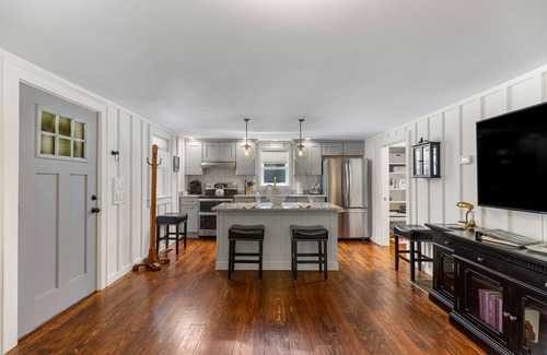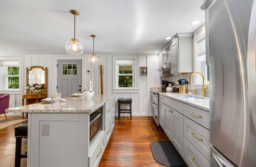 Our 1937 Cabin located near Lake Glenville has been completely renovated top to bottom with no cost spared in furnishings. Everything new!!! Very private on 50 acre estate and the only rental on our property with great access to Lake Glenville, Cashiers and Highlands. Level entry, no steps!!! Gorgeous 1 Bedroom with a new queen bed, luxury linens, Lexington nightstand, small antique round side table, bench, small custom closet and Regina Andrew lighting, 1 Bath with Ronbow vanity, slate tiles on floor, tiled shower with glass door and a fully stocked kitchen. Gray custom kitchen cabinets and large island with microwave and granite countertops, glass top stove with double ovens and counterdepth fridge with bottom freezer drawer. Please note there is NO DISHWASHER or garbage disposal.