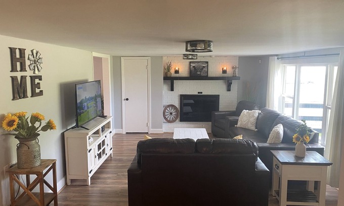 Relax with the whole family at this peaceful place to stay. Adorable Ranch on 2 acres of fully fenced in farm land. Bring your loved ones and pets for this wide open space! Wonderfully updated huge master bath featuring dual showers and a rainfall shower and updated flooring throughout. This 1940s ranch home has the updated amenities combined with its original quirkiness and charm to give you a memorable and comfortable stay. The large driveway has plenty of room for your guests, boats and RVs. The 2 bedroom, 2 full bathroom home was built in the 1940s and has maintained its core characteristics and charm. The homes foundation is still original to the time and is known to have waving floors which may raise and fall throughout the seasons. With traditionally low ceilings at a height of six and half feet, most farm house builders knew that lower ceilings meant less space to heat in winter and, therefore, less wood chopping to fit into a day already bursting with physical activity. While we kept the homes original character we have also added the updated features to make your stay as comfortable as possible. With memory foam beds, high speed internet, full cable smart TVs in every room, games and books for kids. The large 2 acre property is a great place to relax and enjoy a peaceful stay or host your child's next birthday party.