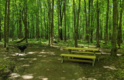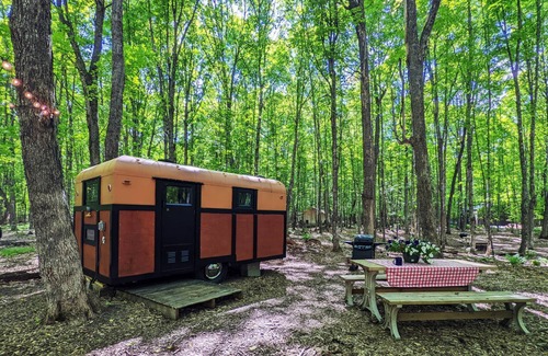 SPACE DESCRIPTION: This camper is outfitted with one camper full-sized futon bed and also has a food prep area (no appliances/water). For bathroom needs guests use the bathhouse. While it is snug on the inside, we feel its authentic character of the early American camping era more than outweighs the smaller interior. Outdoors is home to a charcoal grill, Edison lights, a picnic table, and a firepit. There is also a common gas grill station for guests' use (located between campsites 8 and 9). POV has wood swings and hammocks throughout the resort as well. This camper also provides basic electricity for charging wall lights, phones, laptops, fans, COPD machines, and other low-powered appliances, etc. A space heater is also provided (heaters provided in units – bring your own 1 lb propane canisters or buy them in our store – 1 canister should get you through overnight). There is parking for one vehicle with overflow parking available at the bathhouse.