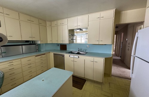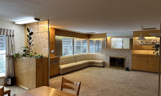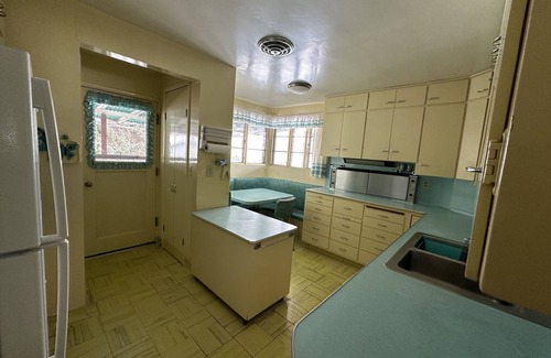 Most of this home is original with built-ins throughout. Cook top original from 1950. Beds and bedding are comfortable for your stay with central heating and air conditioning. Master bedroom with vanity and queen bed. 2nd bedroom 2 twins. Large outdoor upper-level patio with view. (PleaseCover will be replaced this year.) Fenced back yard. Off-street parking for up to 2 cars. No street parking.