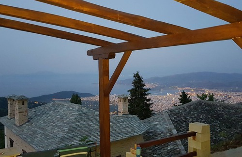 A traditional 3 storey stone built mansion that dates back in 19th century located amongst the mountains of Pelion in a unique Greek traditional preserved village, Makrinitsa nicknamed "balcony of Mt. Pelion. Fully renovated in 2018 by keeping all the original features intact throughout the property, it can accommodate up to 8 guests in a unique, quiet and peaceful location with stunning views of Pagasitikos Gulf and city of Volos.]