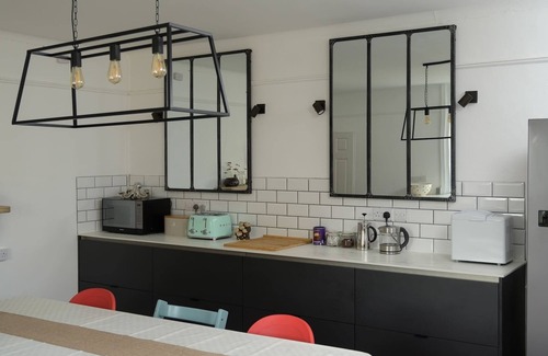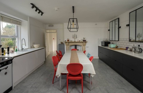 Head downstairs to the ground floor to find the spacious, open-plan kitchen and dining room. It's modern and well-equipped with everything needed to cook up feasts for larger groups. It's also got a wood burner for cosy dinner parties! Next door, you'll also find a downstairs WC and handy utility room.