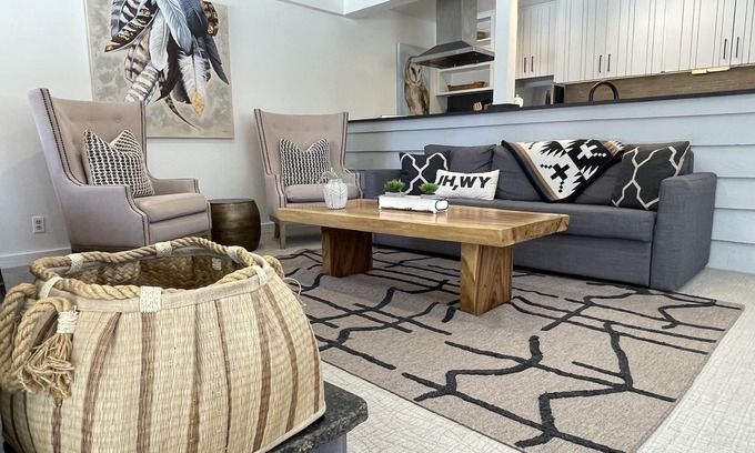 Warm, inviting and lots of attention to detail. Our recently remodeled one bedroom, one bath Aspens end unit will be your home away from home. Lots of open green space to relax and bbq at the end of an adventurous day in Jackson Hole. The bedroom is furnished with a comfortable king size bed with luxurious restoration hardware linens and a flat screen TV. Plush towels, and complimentary Molton Brown shampoo, conditioner and body wash are provided. The living room is equipped with a sofa bed, flatscreen TV, dining table with seating for four and a wood burning fireplace.