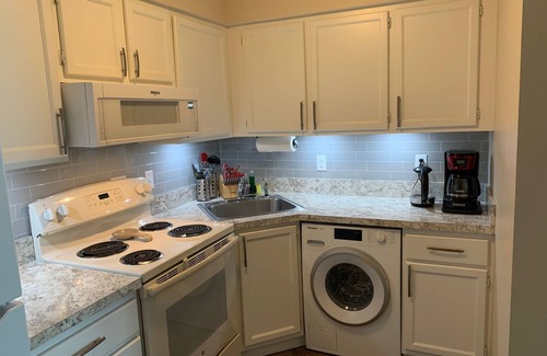 The kitchen features quality appliances, spacious pantry and cabinetry that hold everything you need for extended stays - whether you're preparing full meals or a quick coffee/tea before heading out. Tucked neatly under the counter is a European-style washing machine, perfect for light loads during your stay. If you need a larger washer or a dryer, there's a shared laundry room located in the basement of the building for your convenience.