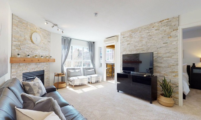 Inside, the spacious layout features a cozy gas fireplace, smart TV, high-speed Wi-Fi, and air conditioning in both the living room and master bedroom. The fully equipped kitchen with Caesarstone countertops makes dining in a breeze, while thoughtful extras like in-suite laundry, secure underground parking, and a BBQ add to the comfort. With sleeping arrangements for up to 6 guests (4 adults max), Marketplace Lodge offers all the essentials for a memorable Whistler getaway.