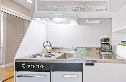 Fully equipped kitchenette: stove, fridge, coffee maker, toaster, cookware, and utensils.