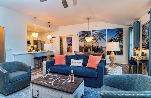 The entire condo was remodeled in 2023 with a coastal theme that exudes tranquility. Enjoy romantic lighting, sleek modern furnishings, and a 55” smart TV for 4K streaming. There’s also a futon sofa sleeper for extra guests, a perfect setup for a 3rd or 4th person.