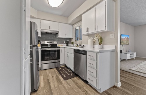 - You’ll have a clean, cozy living space with a Smart TV for streaming and a fold-out futon for extra sleeping space