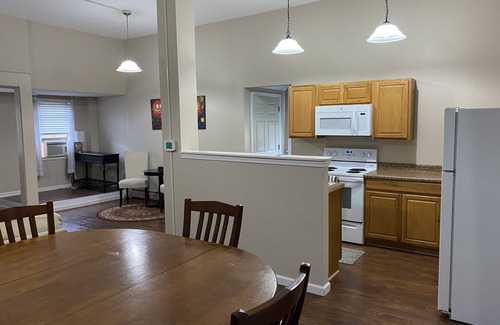 Munson Manor V 1st floor has an open floor plan w/ living, dining and kitchen areas in a very spacious room with high ceilings. There are 2 separate bedrooms and 1 bath off the main area. This apartment is all on the first floor. There are hardwood floors and tile throughout. There is a comfortable couch or an air bed for an extra person.