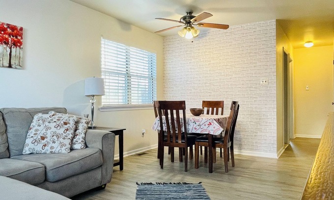 Inside, enjoy a tranquil and fully equipped space with everything you need: high-speed WiFi, air conditioning, heating, a washing machine, and two comfortable bedrooms. Whether you're here for business, sightseeing, or a game day adventure, this first-floor retreat offers both convenience and comfort.