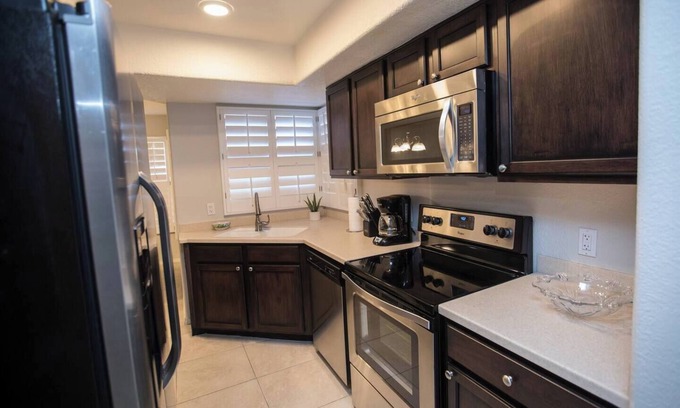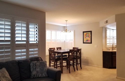 Spacious Condominium near Ventana Canyon features all new tile floors and furniture. 3 bedrooms and 2 bathrooms, ground floor end unit, Corian Countertops, WIFI, DirecTV Cable (Living room and master BR) with over 130 channels and a covered parking space. For Long Term (more than one month) stays, send me a message and we can work on the rates!