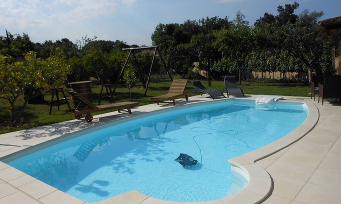House with private pool and large enclosed garden with 3 garden lounges, pool lounge, 5 sun loungers, chairs, stools possibility of eating in the garden, plancha. Closed parking. Children's games.