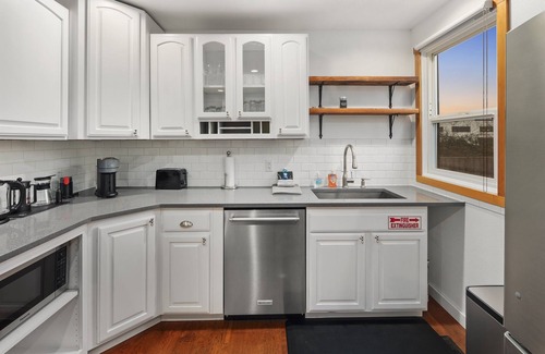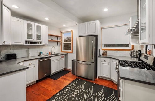 Historic city home meets modern, sleek design in this main floor retreat of a duplex. Spend a night in the cozy living room streaming a favorite series on the smart TV or playing board games with family and friends. There are a plethora of entertaining board games, including Yahtzee!, a 500-piece vintage butterflies puzzle, a Keep-It PNW card game, and Yahtzee (National Parks Travel edition). The kitchen comes equipped with all the essentials needed to whip up culinary masterpieces. There is a Nespresso espresso machine and a variety of espresso pods are stocked in the home at all times. The primary bedroom is outfitted with cozy Earth sheets, a smart TV, and a working desk with a monitor.