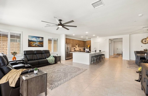 Get ready to relax in this 3-bedroom house in Indio. This lovely property features two Master Suites, Bedroom #3 has Double/Twin Bunk. Spacious Great Room open to Dining and Cooks Kitchen. Covered Patio/BBQ/Serene Backyard on Golf Course & Garage parking. Pet Friendly Community, two Small Dogs ok. Access to 22,000 sq ft Clubhouse with Indoor/Outdoor Pool/Spa, Fitness Center, Pickleball Courts & more. No private pool or hot tub provided. Fantasy Springs Casino, Empire Polo Club (Stagecoach & Coachella festival grounds) and Acrisure Arena within 3-10 miles. 30 night minimum listing, but best to book 31 nights or more to avoid 14% local taxes on rentals , a big savings. Signed rental agreement required prior to your stay-HOA rule. HOA , House and Check rules must be adhered to.