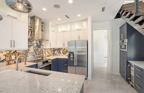 The gourmet kitchen stands out with a bold "Urban Graffiti-Street Art" backsplash, top-of-the-line Bosch appliances, and a wine fridge.