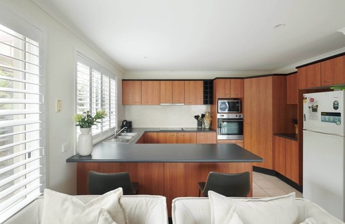 The large kitchen is fully equipped with all necessary utensils and includes a dishwasher, making meal preparation a breeze. Enjoy dinner Alfresco & make use of the private courtyard with a BBQ & water views.