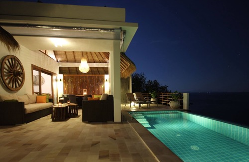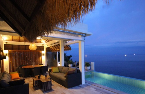 Gecco Pool Villa is situated 35 meters high up on a cliff with panoramic view over the sea and will treat you with wonderful sunsets. This exclusive villa is built with white concrete walls, thatched roofs and large glass openings towards the sea.