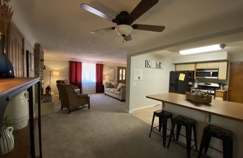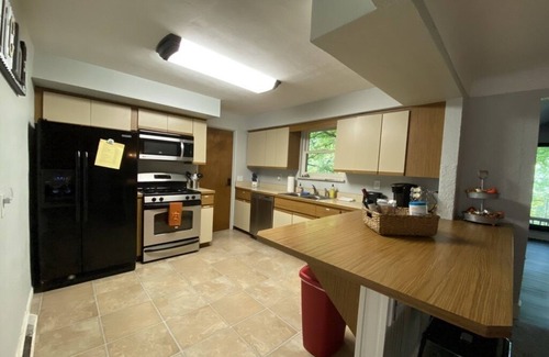 Beautiful three-bedroom home set in 2. 5 acres of grass and woodland at the end of a quiet residential lane in Fairview Heights. Tastefully furnished and decorated with huge dining/ family room overlooking a spacious wooden deck and attractive woodland. Choice of bedrooms with king and queen size beds as well as a children’s bedroom with solid wood bunk beds. All modern amenities, including WiFi, central heating/air conditioning. Plus streaming services like Hulu live, Disney +, ESPN + and Netflix. Plenty of parking in the driveway and easy access to a great selection of restaurants, bars, grocery stores and kid-friendly local attractions.
