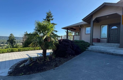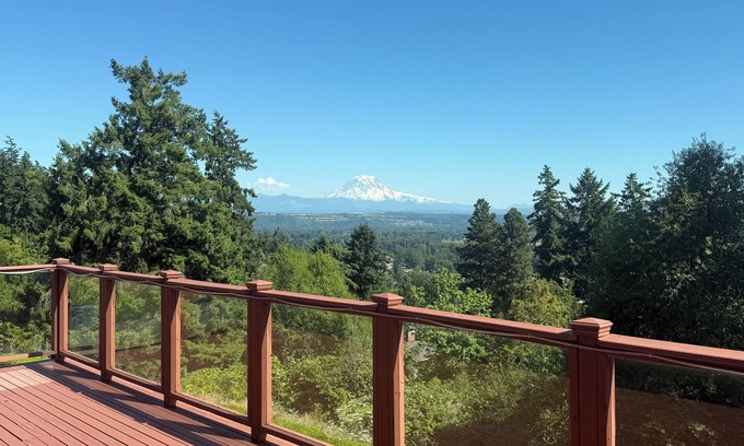 Hilltop 4BR/3BA home on 2 scenic acres with breathtaking Mt. Rainier views! Surrounded by trees and open sky, enjoy the landscaped grounds, two-level deck, and cozy patio. Spacious layout with 1 king & 4 queen beds.