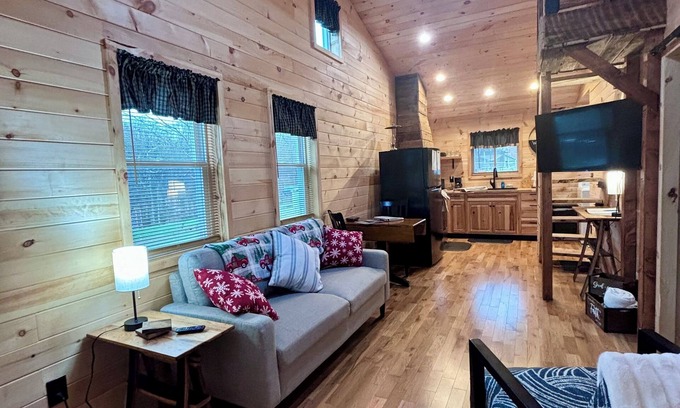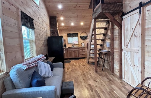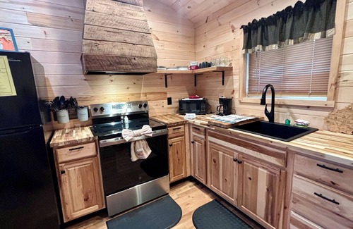 We have taken a lot of pride in building this new structure, completed in the fall of 2024. This cabin has a fully functional kitchen, with all new appliances, beautiful hardwood floors, wood walls, and beautiful live edge vanities. We believe you will be able to rest and make wonderful memories while exploring our little neck of the woods. The stairs, although not a ladder, are steeper than normal stairs. The treads are very unique and have live edge, so the widths are different on each tread.