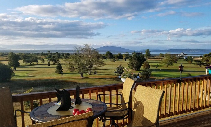 Recently updated home in Whatcom County, Washington with 2 bedrooms (queen beds), 2 full bathrooms, kitchen, dining room, big screen tv, washer & dryer. Furnished with bedding, towels, cooking utensils, dishes, pots and pans, coffee pot, blender, toaster, hair dryer, shampoos, soaps, laundry supplies, etc. Large deck including propane BBQ grill, deck chairs, and table with 4 chairs overlooking the golf course and sweeping views of Mt. Baker and the San Juan Islands.
