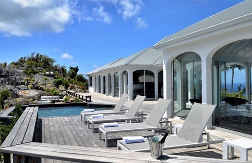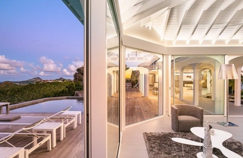 Located at the top of Colombier hill, this luxurious villais an outstanding property opening onto a spectacular view over the oceanand the green landscapes of St-Barthelemy. In an ancient Greek-striking white decor coming with columns and hand-painted frescoes, the surrounding atmosphere serves peace and serenity.