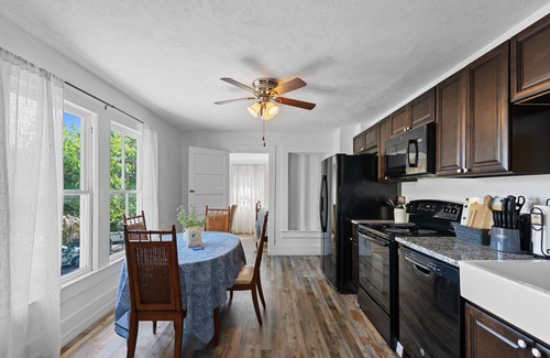 This 2 bedroom 1 bathroom unit is ready for you to come and enjoy! The entire home has been remodeled keeping the charm and history of the house.You walk up the stairs that lead you to your bedroom with a queen size bed and separate dressing area. From there you walk through the hallway to your living room and straight to the eat-in kitchen which is very large with all new finishes and a 4 person table to enjoy your meals. There is also a bonus room at the end of the unit with a full size day bed for guests. The bathroom has been updated with a walk in shower and beautiful finishes!