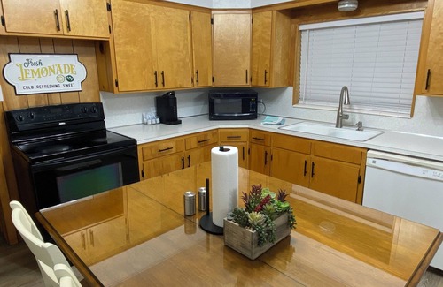 Maxine's Rural Retreat is your home away from home in Richfield with 2 bedrooms, 1 bathroom. This cozy, comfy house sleeps 6 with king bed in the master and twin over full bunk bed plus trundle bed in the second bedroom. Fully equipped kitchen with refrigerator, stove, microwave, dishwasher, coffee maker, and toaster plus pots, pans, and dishes. Bathroom includes a bathtub/shower and hair dryer for your convenience. Free wi-fi. Covered carport with patio table and chairs, plus bike rack. Lots of gravel parking. Quiet, safe neighborhood with mountain views near two city parks. Fenced, secluded yard with hose available for washing bikes/ATV's. One mile from Sevier Valley Center. Within a 2.5 hour drive of all 5 Utah National Parks. Maxine's Rural Retreat is the perfect hub for your next adventure.