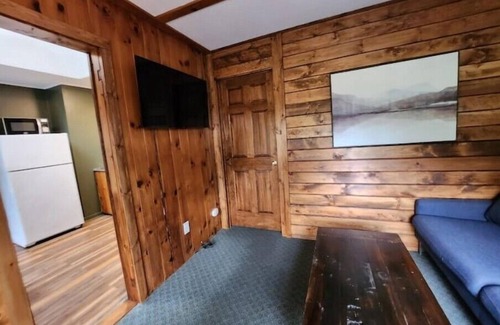 A Traditional log cabin in the authentic adirondack style, offering 2 bedrooms and 2 bathrooms plus living room and kitchen. Cabin 3 at the Cramer's Point Lake Breeze property in Lake George is a stand alone building, built near to others on the property, which features two large homes, several stand alone or duplex cabins and a 4-room motel building. Cabin 3 has a large deck, partially covered, with a patio set and solo camp fire stove (wood burning) for toasting marshmallows and taking the chill off a cool spring or autum night, and a charcoal grill. The design of the cabin offers the comraderie of a shared accommodation, but also a privacy suite with a queen hickory log bed on one side that includes its own full bath. A modest living room and wall mounted TV completes the right side. The kitchen is set in the middle and accessible from both sides. It is a complete work space with a small table. Since we are seasonal cabin, most Guests enjoy their meals outside on the deck to take advantage of the sun and scenery. The left side is dedicated to a large bedroom with a queen bed, a set of twin hickory log bunk beds, a futon couch, TV and a full bath. Quietly and efficient heated and cooled by brand new heat pump "mini split" units. For convenience, both sides have an exterior entrance, allowing different family members to come and go without disturbing another if they wish. Guests have access to all of our traditional family resort amenities, including two pools (in season), games like horshoes, corn hole, shuffle board, playgrounds, and trail to a shared lake access space where we offer complimentary canoe/kayak type boats and safety equipment.