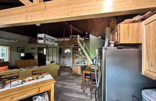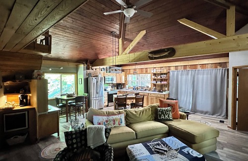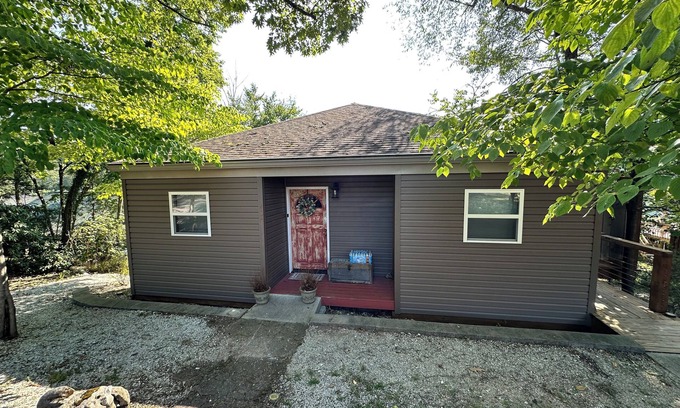 Welcome to The Summer Place, a cozy and modern 2 bed 2 bath lakefront cabin on beautiful Norris Lake. The property features an open floor plan great room with kitchen, dining, and living room space. 2 bedrooms each featuring a Twin over Full built-in bunk bed with memory foam mattress and 600 thread count sheets. First full bathroom is inside with a tile shower, high seat toilet, and copper sink with plenty of storage for your toiletries. Out the French door takes you to a gorgeous outdoor living space complete with dartboard, fireplace, smart tv, gas grill, Blackstone griddle, and sectional sofa that is perfect for napping. After dark, feel free to turn the lights on outside for continued entertainment. Around the corner is the 2nd bathroom. Enclosed toilet and vanity with a relaxing open top private outdoor shower with oxygenating shower head. Outside and around the back of the house is the lower deck, perfect for when you want peace and quiet away from the tv, and cooking upstairs. Basement access is there where you will find a washer, dryer, and additional refrigeration for anything extra. A short walk down the hill or golf cart ride down the street and around the point to the bottom road will take you to the private dock, where you can enjoy swimming, fishing, or park your rental boat for easy access. Our family loves this property with all our hearts and we know that after your first stay, you will too.