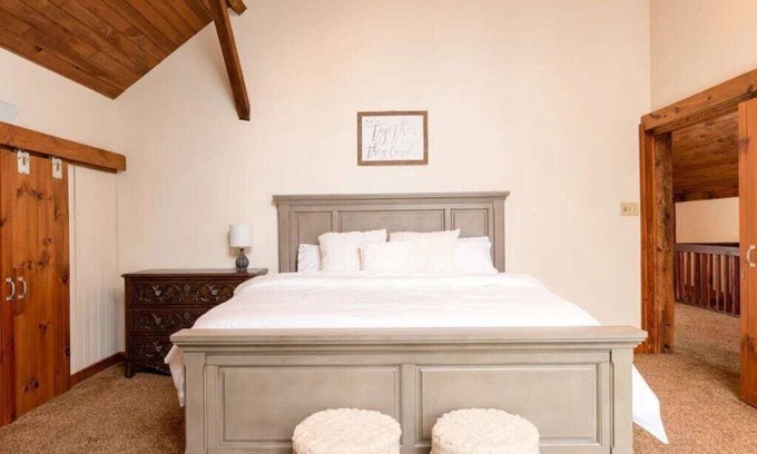 Head upstairs using the original barn wood staircase and you will find an expansive exposed natural light filled loft (bedroom #2) with impressive A-framed ceiling and not one but two beautiful matching farmhouse style queen beds, closets with sliding barn doors, an additional comfortable pullout ottoman single bed, and a quaint balcony to take in the morning air.