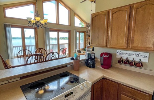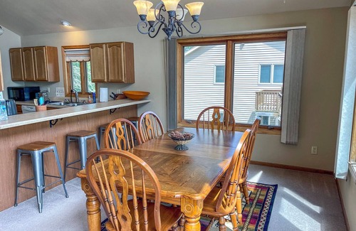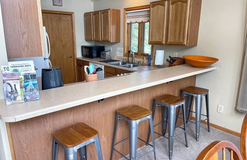 This spacious two bedrooms upper unit sleeps seven and is decorated in a modern Northwood style. The bedrooms consist of a Queen lakeside room with a patio door and access to the large deck area; the 2nd bedroom is a Queen and a twin. Large main bathroom. Some great inside features include a spacious living with a pull-out couch, futon and a dining room area with a gas fireplace and a TV. Fully stocked kitchen with stove and microwave. Bath, beach, kitchen towels, and bed linens provided extra pillows and blankets. The bathroom is stocked with shampoo, conditioner, and other toiletries. The kitchen contains dinnerware, utensils, cookware, coffee maker, reusable food containers, water bottles, and pantry items. A grill and chairs can be found on the outside deck — the dining room table seats eight and four seats at the high-top counter.