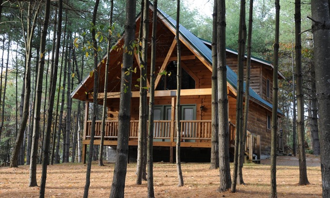 Fully equipped cabin situated in a scenic wooded setting, includes private hot tub, pellet fireplace, Wi-Fi, full kitchen, washer/dryer, central heat & air, cable TV, and much more. This two story cabin has a queen bed in the downstairs master bedroom along with a full bathroom. The second floor has a second bedroom with a full bed and an open loft area with a twin bed. There is an additional full bathroom on the second floor. The living room has a pull out sleeper sofa. Pet friendly with a $50 pet fee.