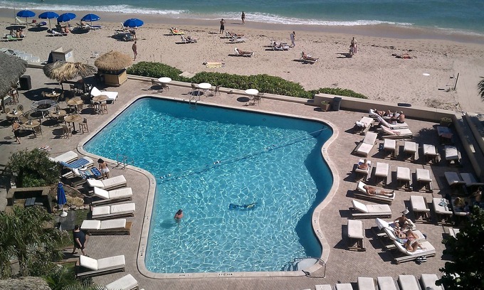 - Oceanfront condo, beach, pool. 4 eateries on premises. Rent kayaks and jet skis.