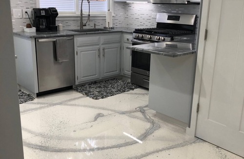 Located in a quiet neighborhood. This 2 bedroom 2 bath home was recently rehabbed. The open floor plan makes it easy to feel included whether you are in the living room, dining room or kitchen. The bedrooms have one king and one queen size bed equipped with quality bedding and t.v.'s. A Pack 'N Play and high chair can be available upon request. There is a fully stocked kitchen with stainless steel appliances. A breakfast bar that seats 4 and a dining room table that seats 6. For business travelers there is a desk and high speed internet.