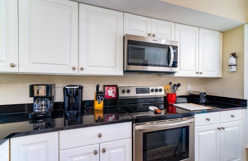 The interior features a bright, open floor plan with soaring ceilings, wood floors and a wall of windows that highlight the spectacular scenery. The living/family room has plenty of comfortable seating with a 55" HDTV. Adjacent to the family room is the dining area with seating for 6 and is open to the kitchen. There are 2 counter height chairs for additional seating at the breakfast bar. You'll appreciate the well appointed, fully stocked kitchen with granite counter tops & stainless appliances