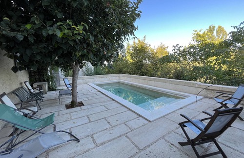 Beautifully renovated two bedroom/two shower room apartment in an ancient former convent. Large double bed and two singles for up to four people. 2 mins walk for your baguette and croissants. Off-street parking. Pool. Boule pitch. Event room. Wifi. Wheelchair access.
