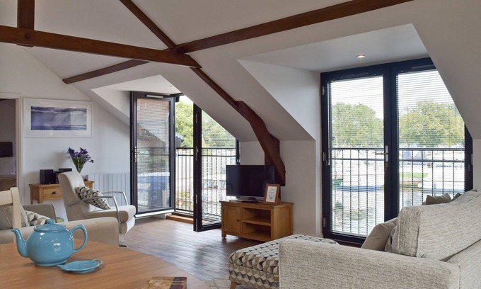 Shower Room: Cubicle Shower, Toilet. Electric central heating, electricity, bed linen, towels and Wi-Fi included. Welcome pack. Small courtyard with terrace and garden furniture. Private parking for 1 car. No smoking. Please note: There is an unfenced river in the courtyard, 10 yards away.. This first floor conversion of a detached boat shed, with the owner living on-site, overlooks the River Waveney in a private marina. The open plan living areas and floor to ceiling windows open out onto Juliet balconies and include a private sun terrace. Beccles is the heart of the Southern Broads that form part of the Norfolk Broads National Park. This quaint market town is host to delightful pubs, restaurants and artisan cafés. The River Waveney runs right through the town and you can hire day boats close by and there are marked walking routes and perfect wildlife spotting from the elevated position of the apartment. Beccles Lido, a traditional outdoor heated swimming pool that sits alongside the river, is a ’must see and do’ experience during the warmer months. To the east you can visit Lowestoft, with sandy beaches, traditional piers and fine seafood dining. To the west you will find Norwich, a fine city, home to a castle, cathedral and superb shopping, restaurants and nightlife. Beach 10½ miles. Shops, pubs and restaurants 400 yards.
