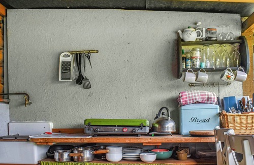 Away from it all, a lovely large bell tent with a cosy cabin, which also features a separate compost toilet and shower.. All on the ground floor.