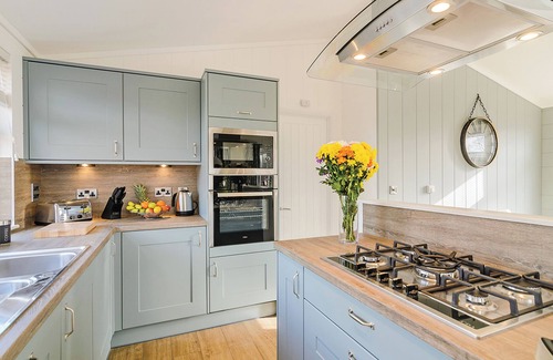 Stunning and stylish lodge featuring one contemporary double with en suite shower and one well-sized twin. Spacious bathroom with bath and overhead shower. Luxurious, well equipped open-plan living/kitchen area. Patio doors leading to spacious decking. Perfect for a break to celebrate any occasion. Pets allowed in selected accommodation only.