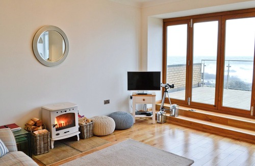 Shower Room: Cubicle Shower, Toilet. Gas central heating, gas, electricity, bed linen, towels and Wi-Fi included. Initial logs for wood burner included. Balcony with outdoor furniture. On road parking.. With spectacular sea views from the moment you open the door of this ground floor holiday apartment, situated within a terraced row, the light and views are captivating. Contemporary furnishings and the cosy woodburner provide great comfort whatever the weather outside, whilst the wide balcony is perfect for watching the sunset. Originally a grocer’s shop in the fishing village of Cellardyke, there are bars and small shops locally, and Anstruther, ½ mile, has a good range of amenities and boat trips to the Isle of May from the harbour. St Andrews, 10 miles, has a host of golf courses, boutique shops and a wide range of bars and restaurants. Shop 350 yards, pub 25 yards and restaurant 50 yards.