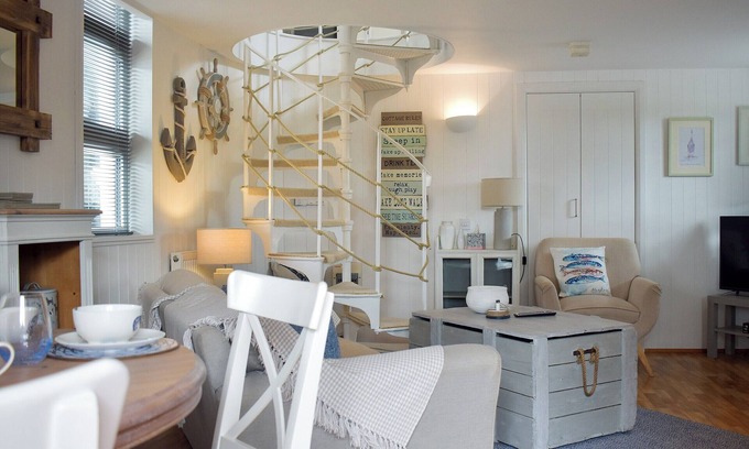 Bathroom: Bath, Cubicle Shower, Heated Towel Rail, Toilet. Gas central heating, gas, electricity, bed linen, towels and Wi-Fi included. Travel cot, highchair and stairgate available on request. Enclosed garden with garden furniture. 2 small dogs welcome, to be kept on a lead at all times. On road parking. No smoking.. Swallows Cottage is situated just outside Brixham and is a two-bedroom holiday home accommodating up to four guests. The open plan living space makes it easy to while away lazy evenings in style, and features such as the treasure chest coffee table and the spiral staircase in the living space give the cottage a contemporary feel. There is a bright, elegant quality to this space that makes it easy to unwind after a busy day exploring Brixham’s attractions, and whether you visit as a family or with friends, you’ll find the cottage makes a welcoming base to return to at the end of a day exploring. Outside, you’ll find a modest size garden complete with a table and chairs for four and a grassy area. When bedtime rolls around, you’ll find the master bedroom awaits and it’s a cosy space to retreat to at the end of a day.