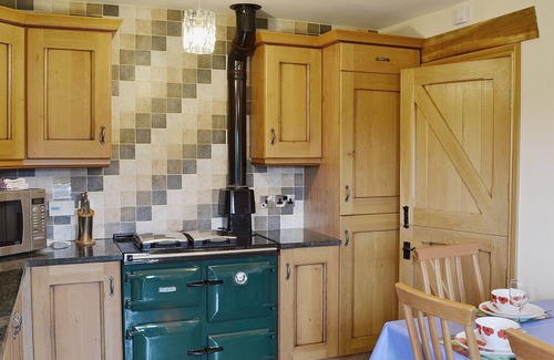 Kitchen/dining room: With Rayburn, microwave, fridge, freezer, dishwasher and patio door leading to garden.